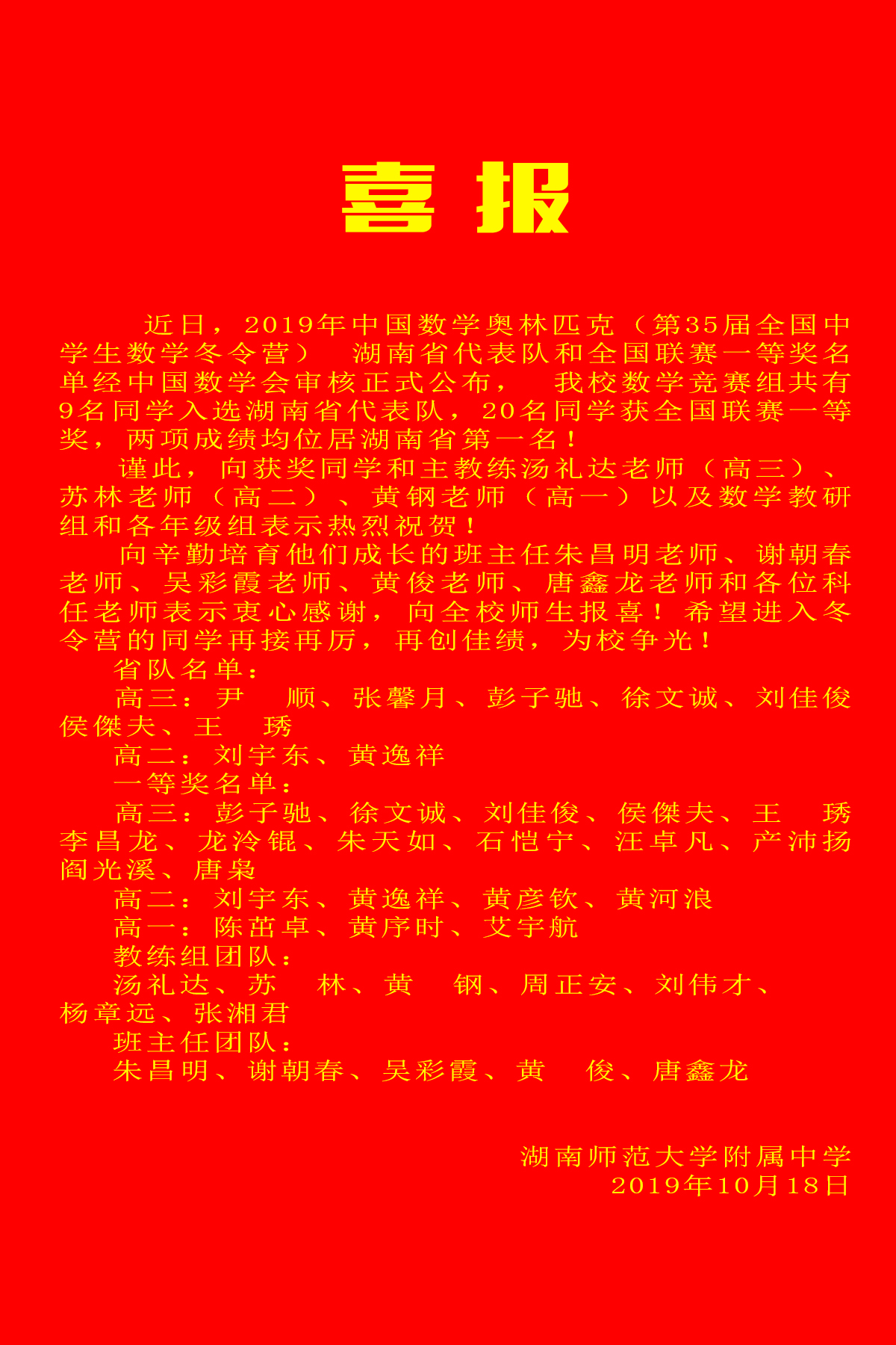 喜报:湖南师大附中27名同学入选中学生学科竞赛省代表队,当年入选省代表队人数位居全省第一!