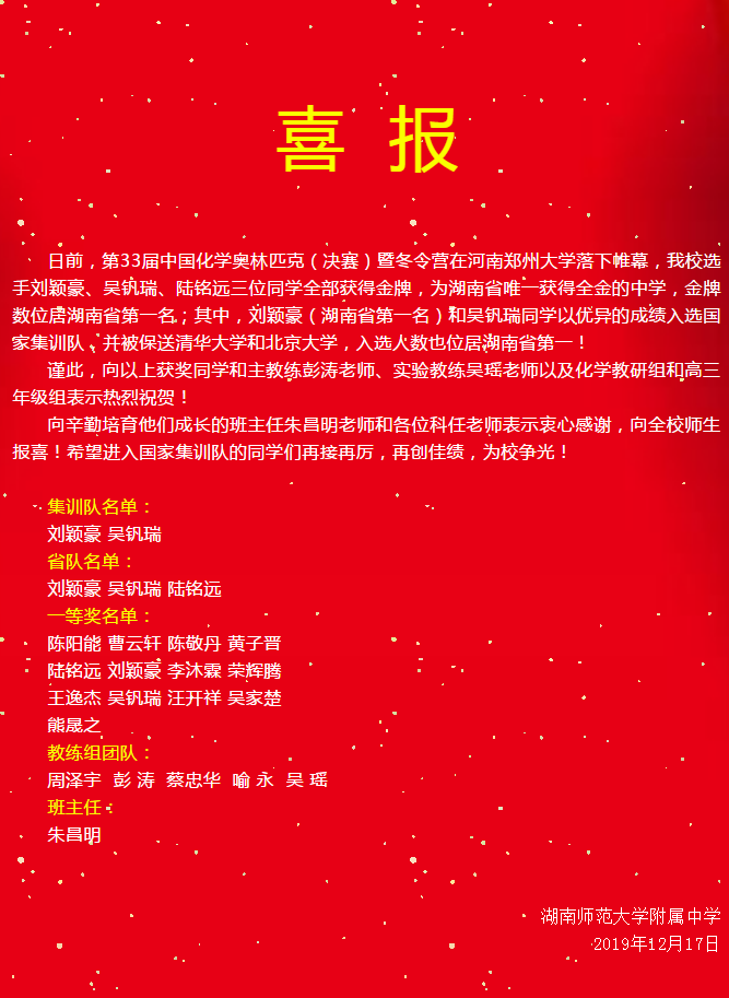 喜报:湖南师大附中刘颖豪、吴钒瑞两位同学入选化学奥赛国家集训队