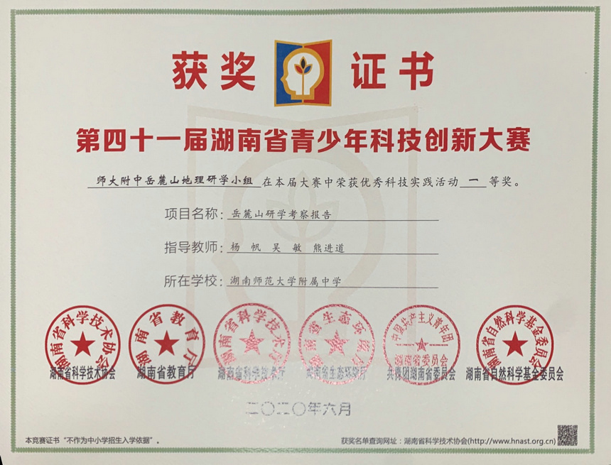 | 岳麓山研学考察报告 | 岳麓山地理研学小组 | 杨帆、吴敏、熊进道 | 科技实践活动类一等奖 |