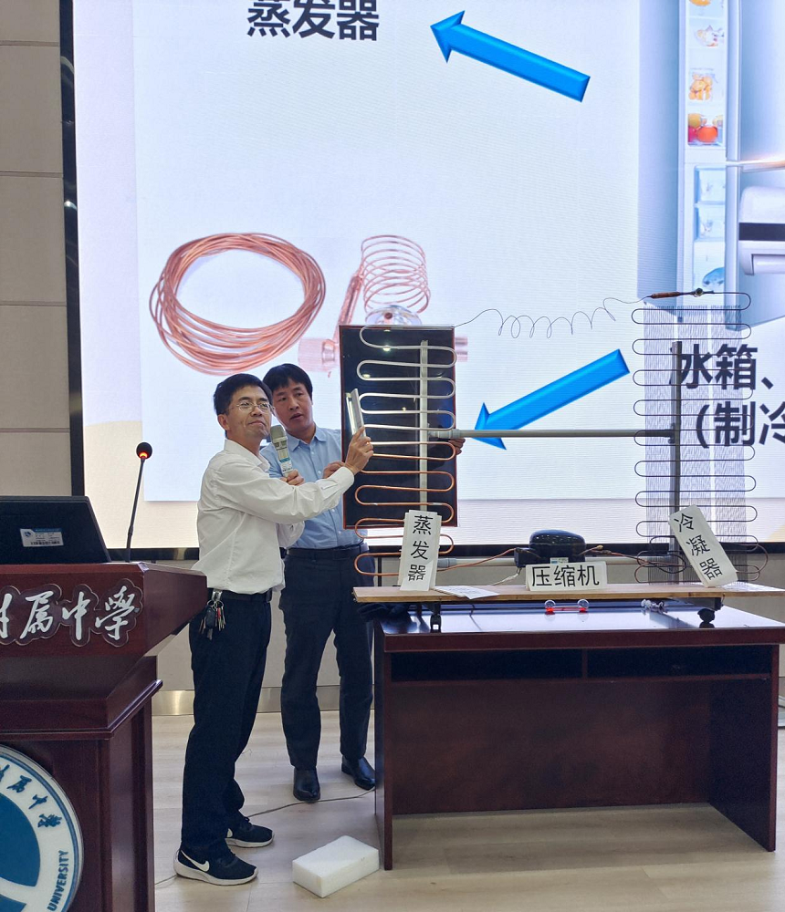 熊教授在活动中进行了精彩的科学探秘。熊教授带领学生揭秘空调与冰箱的制冷奥秘。为了给学生更好的现场感受与体验,熊教授对空调和冰箱进行拆分与拆解,把空调与冰箱制冷的压缩机、蒸发器、毛细管等制冷器件展示给大家,现场演示了空调冰箱的制冷过程。熊教授与学生们的互动良多,学生们在科学探秘中表现非常热烈,纷纷提出问题,表达想法。在熊教授的科学探秘中,普及了科学知识,激发了学生对科学与科学制作的浓厚兴趣。