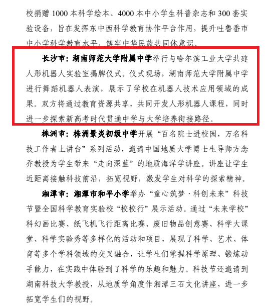 湖南师大附中积极响应国家“双减”政策号召,不仅有效减轻了学生的学习压力,还在科学教育领域持续发力,实现了教育质量的稳步提升。我校与哈尔滨工业大学携手共建的人形机器人实验室于成功揭牌,标志着双方在科技教育合作上迈出了坚实的一步。