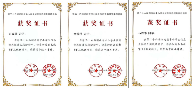 近日,第二十六届湖南省中小学生信息素养提升实践活动结果揭晓。我校机器人竞赛团队选派的10名学生全部获奖,获省级一等奖5人、二等奖5人,学校获评“优秀组织奖”。