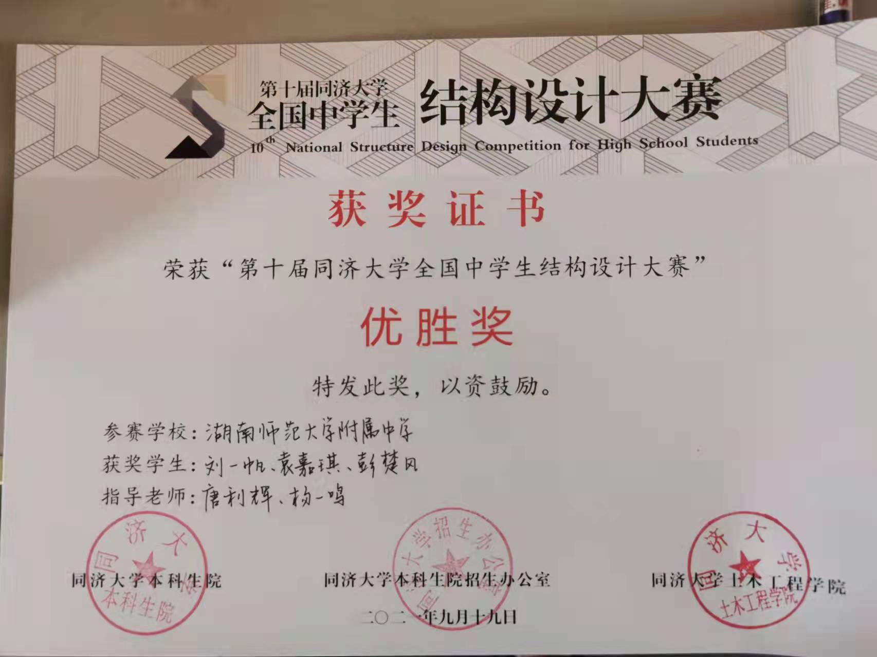 本次比赛共有来自14个省、直辖市的39支参赛队伍,虽然是线上比赛,但精彩不减。我们领略了形态各异的多种桥梁模型,体会了结构设计的博大精深,各校的桥梁都很美观、结实,让我们开阔了眼界。本次比赛,我校三位同学获得了优胜奖。虽然只是优胜奖,但是在这个过程中,大家都收获了很多。这是大家第一次自主探索一种具体模型的设计与制作,尽管过程中有失败,不过收获更多的是失败中的成长。学生在本次比赛中积累了丰富的经验,这是一次探索过程,也是一次研究过程,相信他们在今后的学习中,能将这种探索、研究的精神继续贯彻,努力成为国之栋梁。