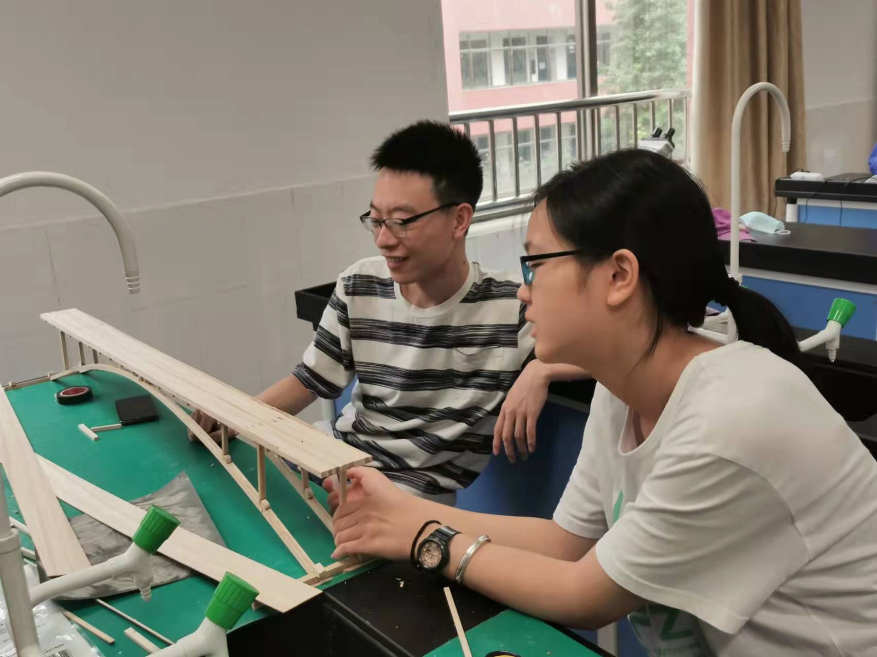我校参赛学生提前一个月开始备赛。8月21日,我们邀请了湖南大学土木系的刘颖峰博士给学生做桥梁结构的专题讲座,随后学生开始制作第一个桥梁模型。彭楚峰同学提出拱的结构稳定,承载力较强,决定用拱支撑桥面,确定了设计方向。