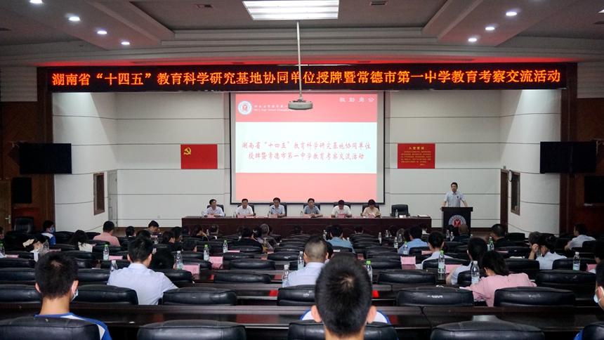 20日上午,基地协同单位授牌仪式在常德市第一中学百年讲堂举行。仪式由常德市一中校长李世明主持。常德市一中党委书记唐会荣致欢迎辞,党委书记黄月初向四个协同单位授牌,科研与教师发展处主任刘进球作了基地宣讲,桃源县一中党委副书记陈淑平、常德外国语学校校长朱方武、桃花源一中校长李俊代表协同单位作表态发言,最后,常德市教育局党组成员、副局长覃道勇发表讲话,感谢湖南省规划办和湖南师大附中的信任和帮扶,希望四个协同单位在团队合作上展示新力量,在教育科研上实现新突破,在普通高中教育高质量发展上谋求新跨越。