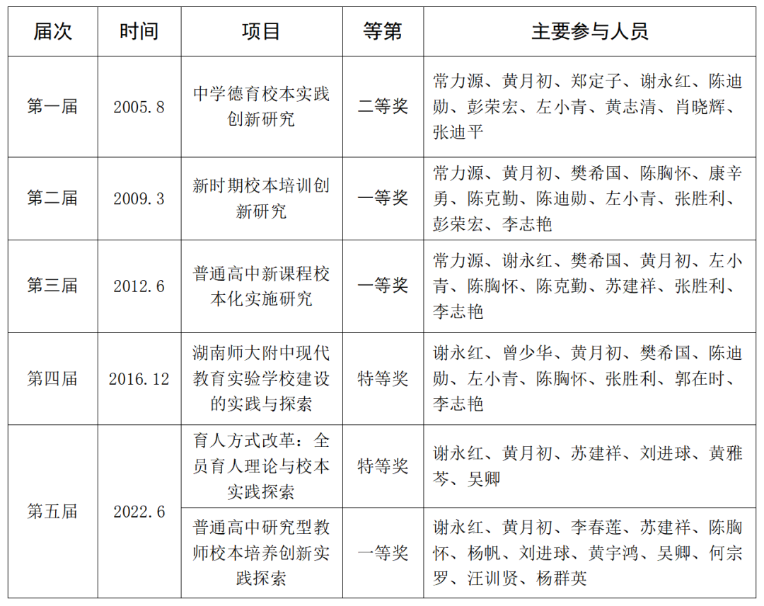 湖南省基础教育教学成果奖是湖南省基础教育教学研究领域最高奖项,自2005年创设以来已评选五届。我校在历届湖南省基础教育教学成果奖评选中收获颇丰,获奖情况如下: