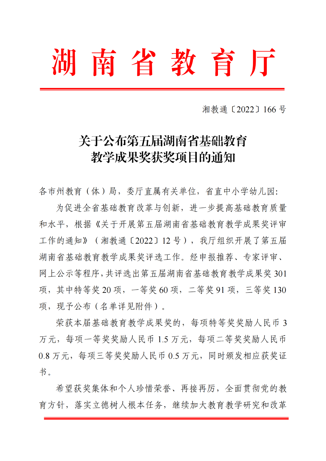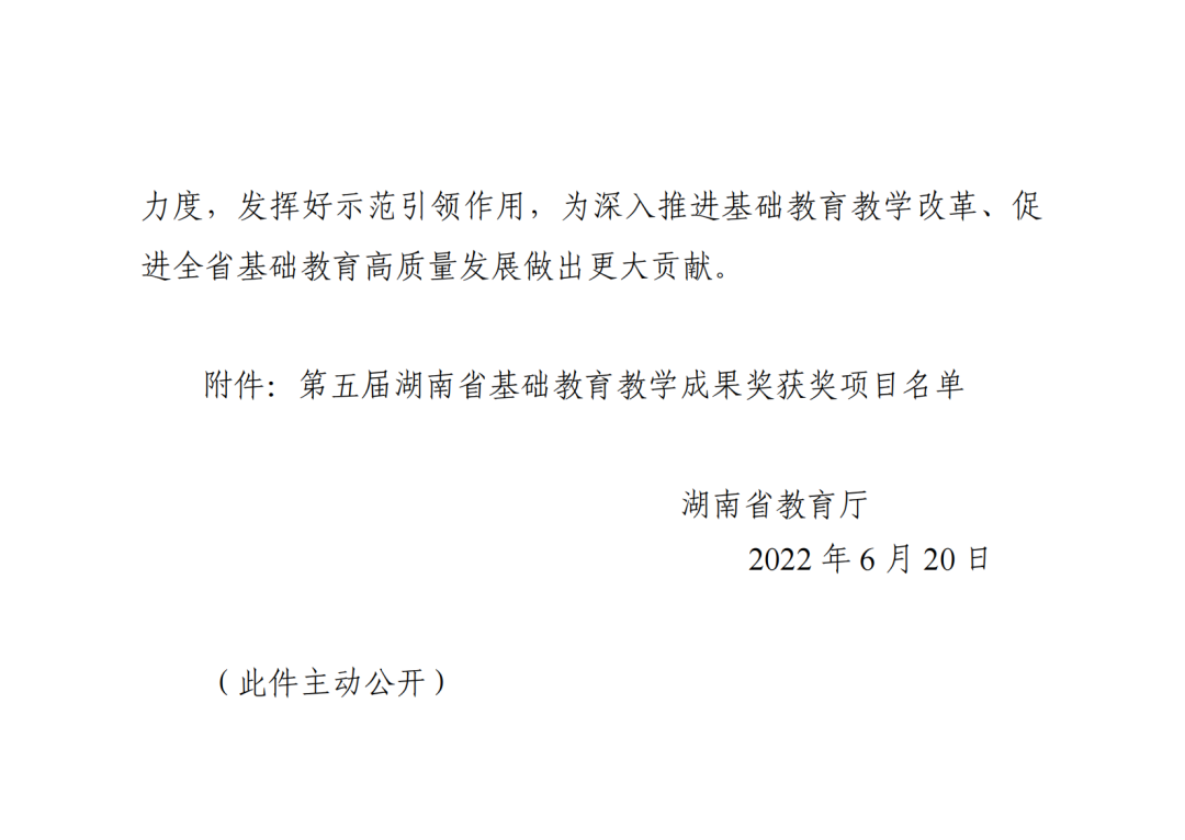 6月20日,湖南省教育厅下发《关于公布第五届湖南省基础教育教学成果奖获奖项目的通知》(湘教通〔2022〕166号)文件,湖南师范大学附属中学申报的《育人方式改革:全员育人理论与校本实践探索》和《普通高中研究型教师校本培养创新实践探索》两项成果,分别荣获第五届湖南省基础教育教学成果奖特等奖和一等奖。