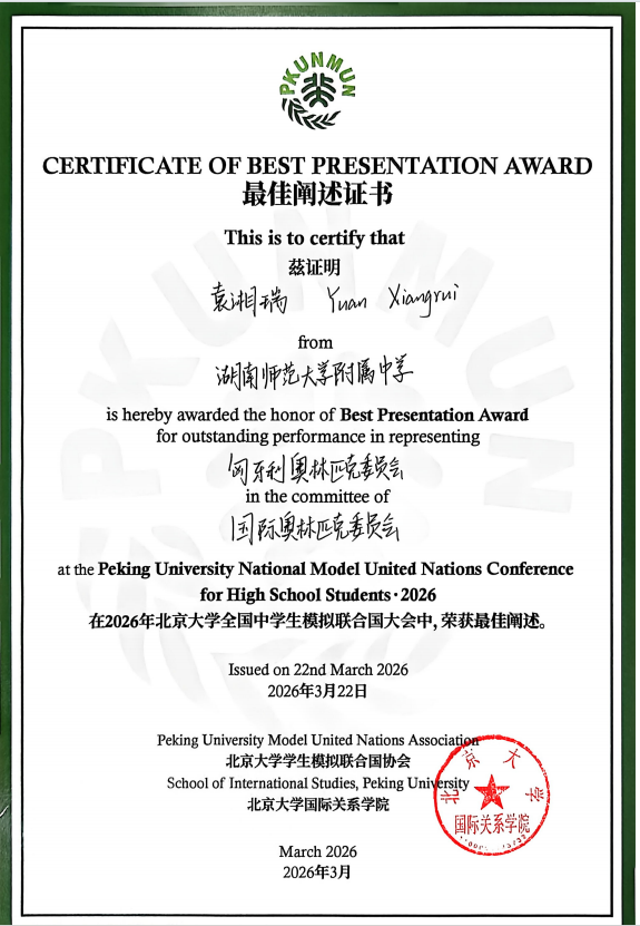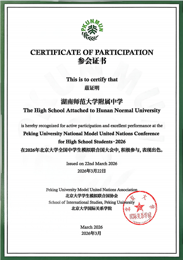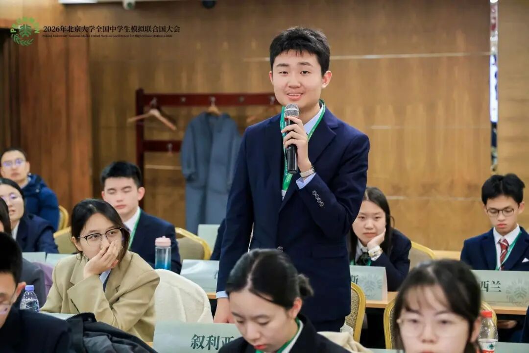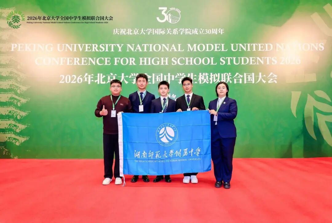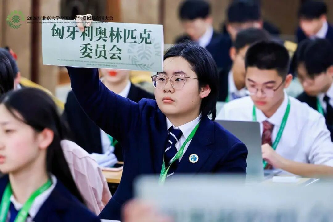 3月20至22日,来自全国各地的300余名优秀中学生代表齐聚燕园,参加由北京大学国际关系学院主办、北京大学学生模拟联合国协会协办的2026年北京大学全国中学生模拟联合国大会,以国际视野探讨全球议题,用理性思辨展现青年担当。经过严格学测选拔,我校由高一年级袁湘瑞,高二年级李嘉涛、谭逸轩、李嘉熙四位同学组队参会。