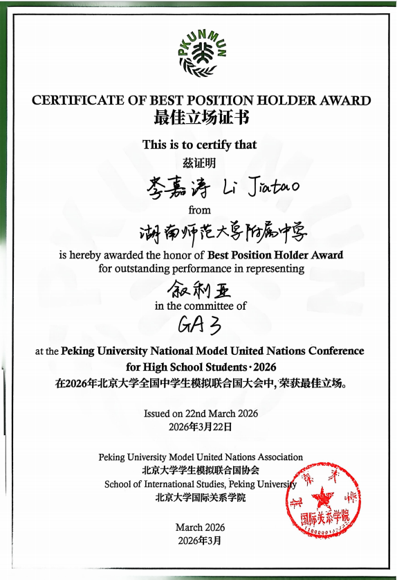 在联合国大会第三委员会的会场中,我校高二年级李嘉涛同学以叙利亚国家代表的身份崭露头角。他凭借对叙利亚人权状况的深入研究和精准把握,在发言中始终坚定维护叙利亚的国家立场,用详实的数据和严谨的逻辑阐述了叙利亚在人权保障方面所做的努力以及面临的挑战。他的发言不仅赢得了在场代表的广泛认可,更充分展现了对国际政治局势的深刻理解。经过多轮激烈角逐,李嘉涛同学凭借出色的表现荣获“最佳立场”奖。