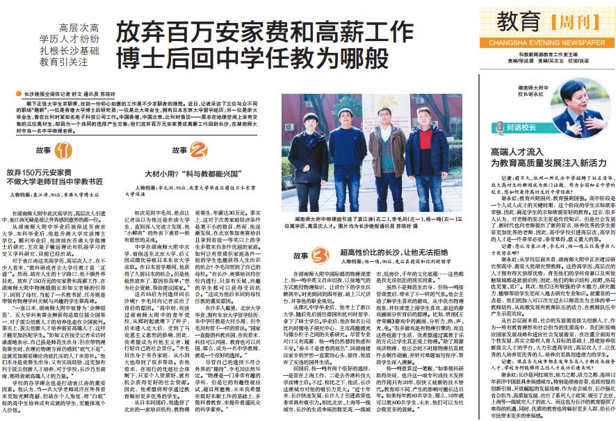 谢永红:从学校层面来看,湖南师大附中正在建设研究型高中,需要大批研究型教师。这些高学历、高层次的人才拥有得天独厚优势,首先他们的学科背景以及所接触领域都是最前沿的,因此,他们的知识结构、视野、格局也更宽、更广。其次,他们还有较强的学术能力、研究能力,能够帮助学生更深入地去研究专业知识。最重要的一点是,他们的加入可以改变过去以师范生为主体的单一教师结构,从而激发现有教师队伍的活力,在教师队伍中产生示范效应。从社会层面来看,社会的发展需要拔尖创新人才,作为一所有教育理想和社会担当的优质高中,我们积极响应国家发展战略和适应社会发展需要,在注重全面而有个性发展,落实立德树人育人目标的基础上,搭建培养创新拔尖人才的平台,大力引进高学历、高层次人才,让优秀的人培养更优秀的人,培养出更具创造潜力的学生。