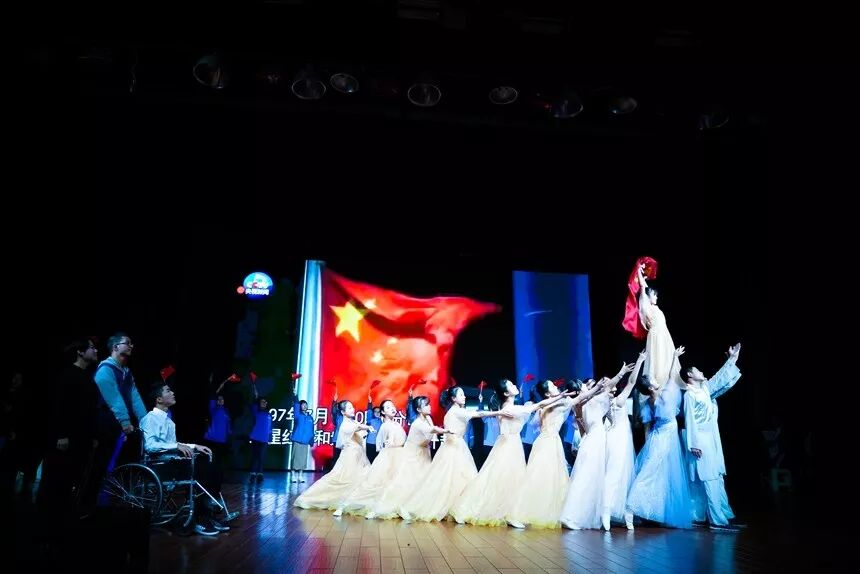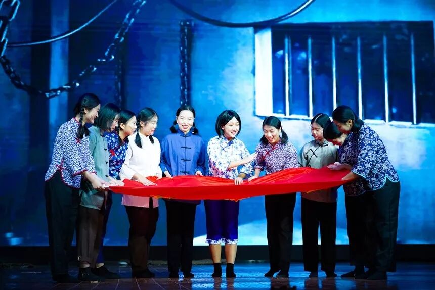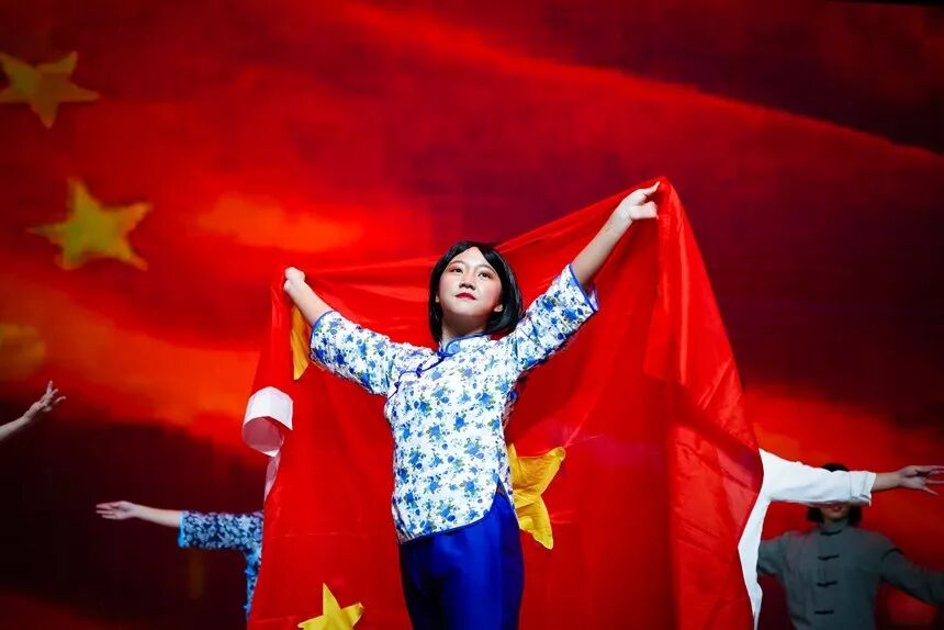 1802班的《一旗流红 亿炬烁光》,讲述了一家四代人与五星红旗的情结,他们通过不同时代的表演,让同学们更加清楚五星红旗对中国人民的意义。