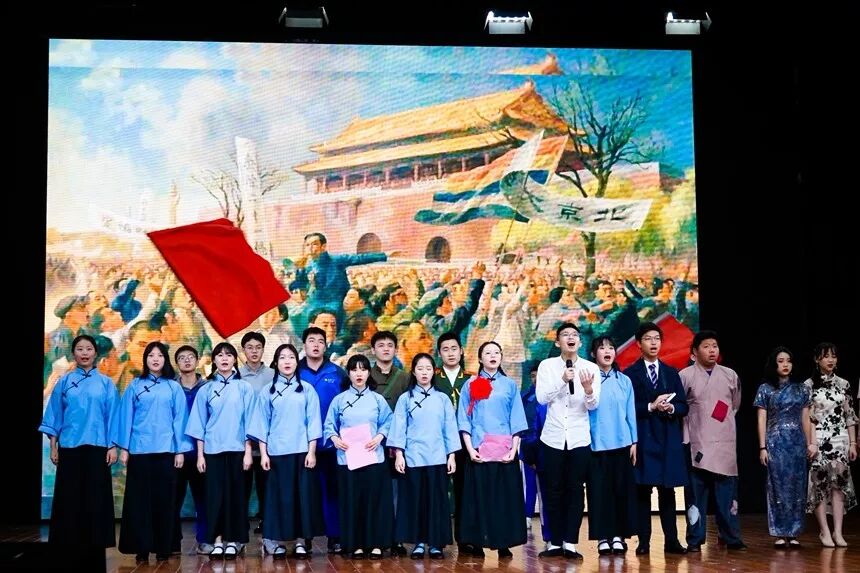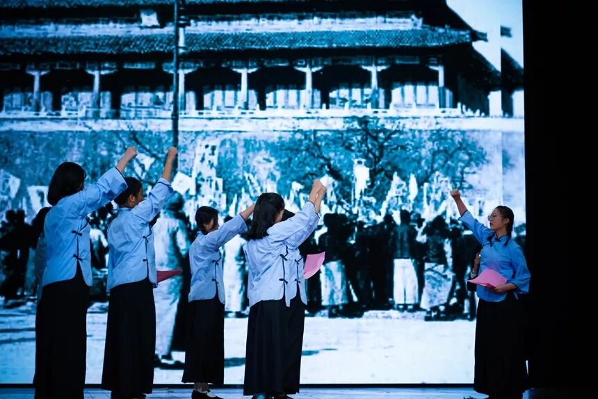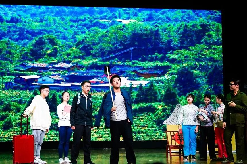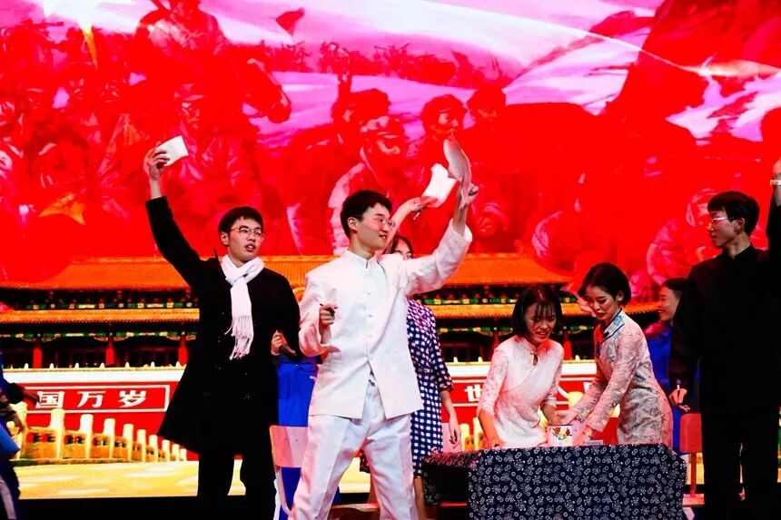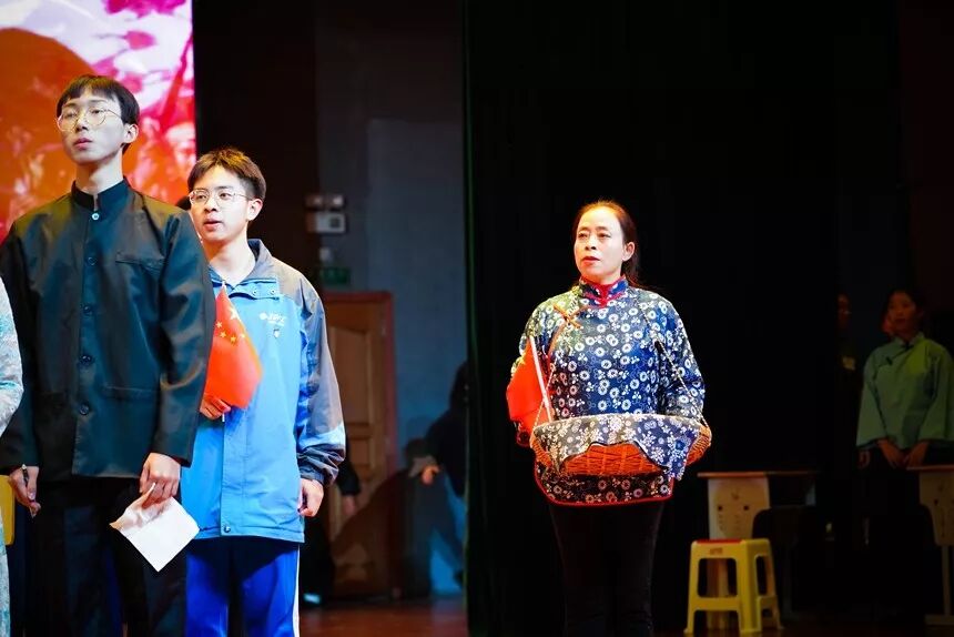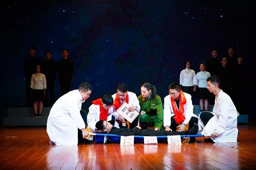 1806班《论始相对,文成梓丘》特别邀请了彭草老师登台演出,他们极力表现当年青年学生积极报国、为核武器事业贡献力量的故事。