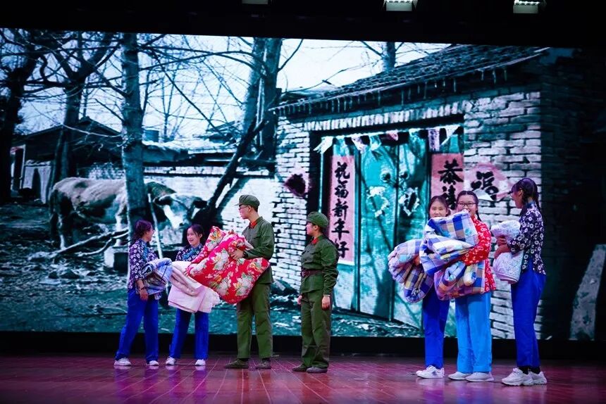 1809班的《生命的留言》讲诉解放战争胜利前夕,解放军战士战死在战场上,百姓送花被子盖在了战士的英勇身躯上的故事,让我们看到了为解放中国而奉献的人物故事。