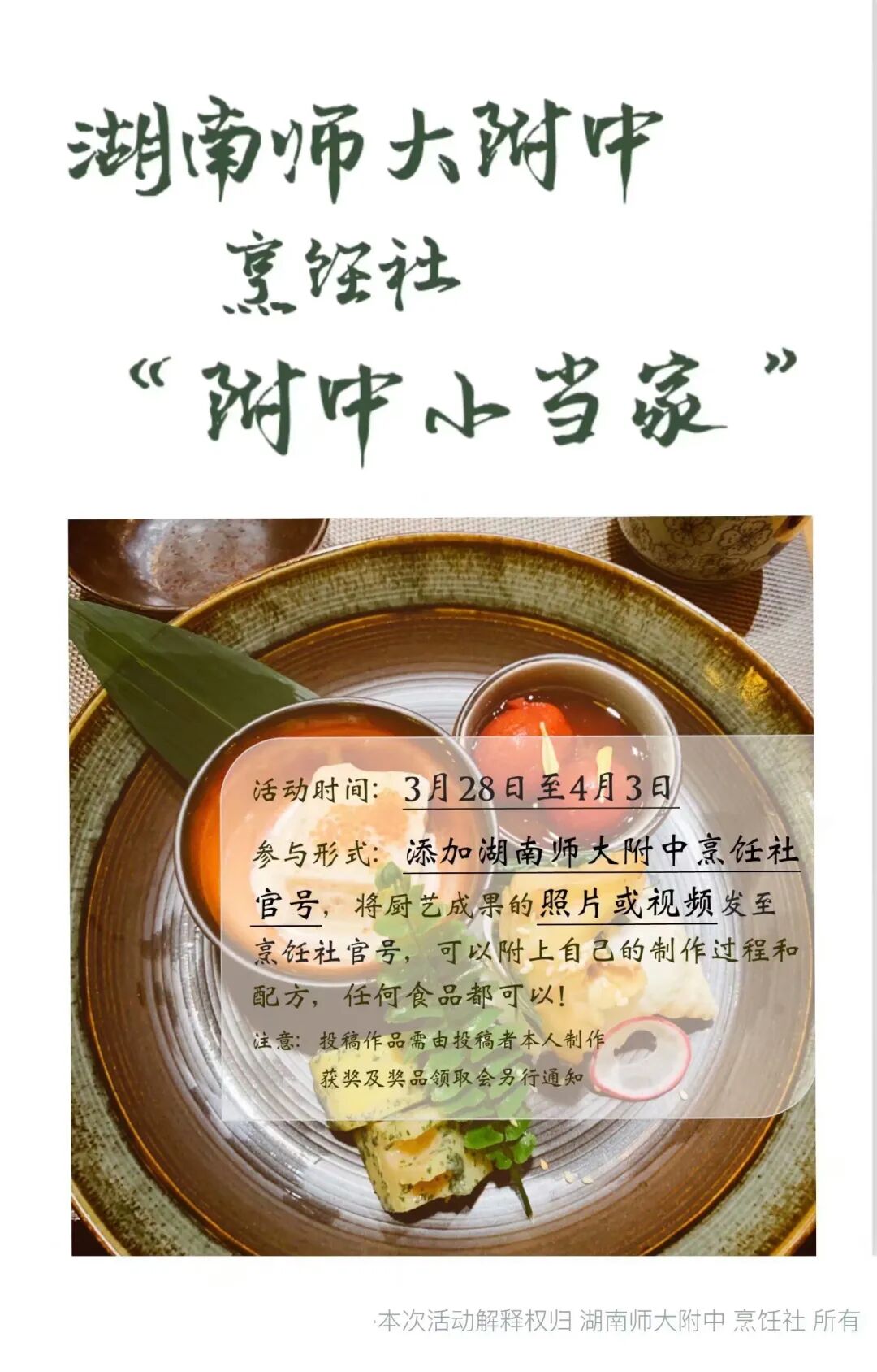 不能出门的日子里同学们对火锅、奶茶、蛋糕、烤肉......的思念之情难以抑制 既然无法出门“觅食” 那么你有没有想过自己亲自动手?烹饪社推出了【“附中小当家”—线上厨艺大比拼】活动,为大家积极劳动的成果提供了一个展示的平台!