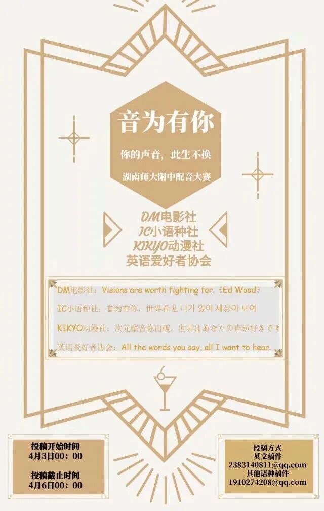 “你的声音,此生不换”由 电影社,动漫社,小语种社,英语爱好者协会 联合举办的附中配音大赛顺利开展,各位同学们用声音倾情出演,让听众身临其境,收获一致好评!