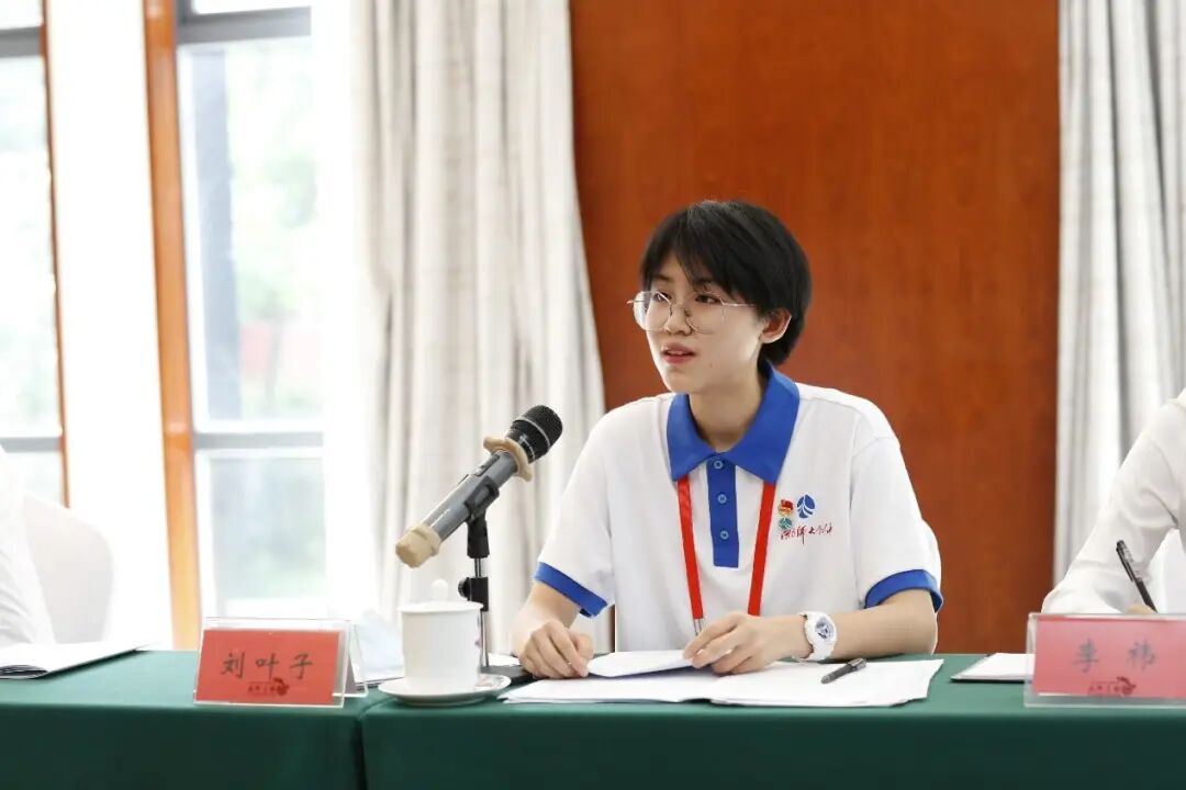 分团会议上,刘叶子在全国学联第二十七届代表大会分团会议上,就习近平贺信、贺军科致词、王圣博的工作报告,围绕湖南师大附中是如何、我们又该如何不断深化学生会组织的改革事业、推动青年学生的未来发展,发表了自己的感悟与理解。