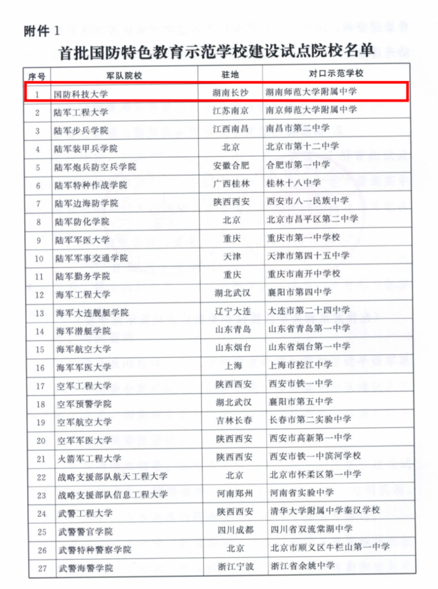 近日,教育部和中央军委训练管理部联合印发的《关于开展国防教育示范学校建设试点的通知》已发至我校。从文件中获悉我校很荣幸被遴选为首批国防特色教育示范学校,由国防科技大学负责协调并参与制定我校年度国防特色教育并提供军事教学师资和相关资源,配合开展国防教育相关活动;这也是继我校2017年荣获教育部“国防教育特色学校”荣誉后的又一重要殊荣。