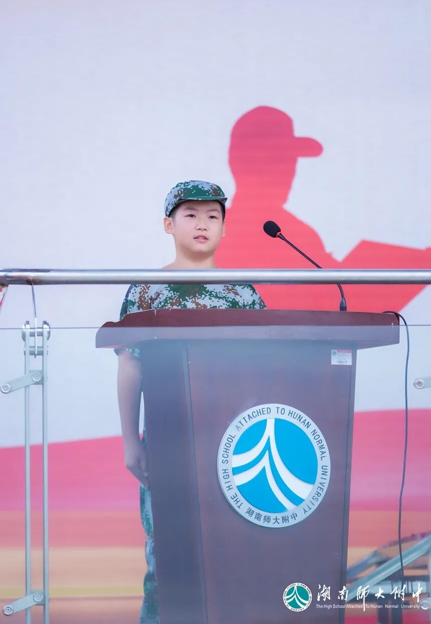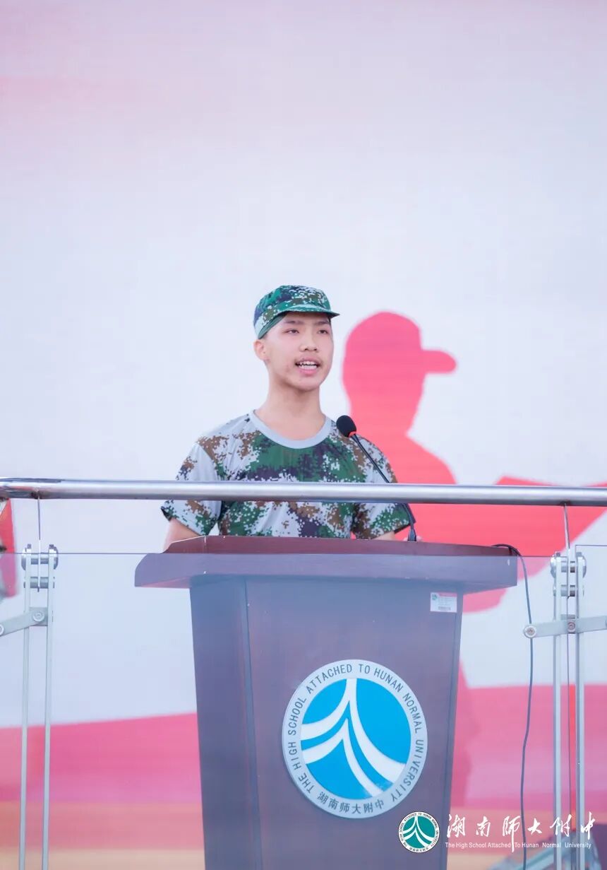 高一年级新生代表2019班谢德钧同学发言。七天的军营生活体验让他深切体会到了军训的目的:严明纪律、锤炼品质、改变习惯。他代表新生们承诺,日后将以优秀军人为模范,争做优秀附中人!