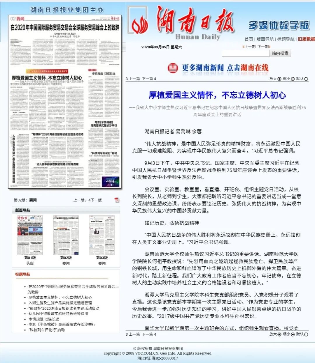 湘潭大学马克思主义学院本科生党支部组织党员、入党积极分子观看了直播。这也是该党支部本学期第一次主题党日活动。“作为党史专业的学生,今后我会进一步加强对历史知识的学习,讲好中国人民艰苦卓绝的抗日战争的历史故事。”2017级中国共产党历史专业本科生孙林宏说。南华大学以新学期第一次主题班会的方式,组织师生观看直播。校党委委员、副校长何旭娟表示,作为高校教育工作者,就是要坚持立德树人根本任务,通过历史教育、国情教育等形式,弘扬伟大的抗战精神,把爱国主义融入学生培养的全过程,为中国特色社会主义培养更多的建设者和接班人。
