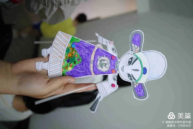 了解皮影戏起源后,同学们开始学习操纵皮影人,并积极动手制作皮影人。通过选色、涂色、固定等步骤,很快各式各样的“影人”新鲜出炉。